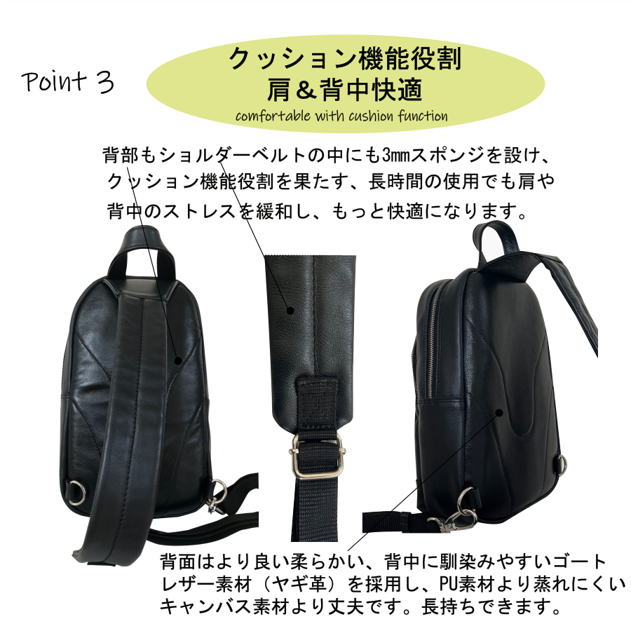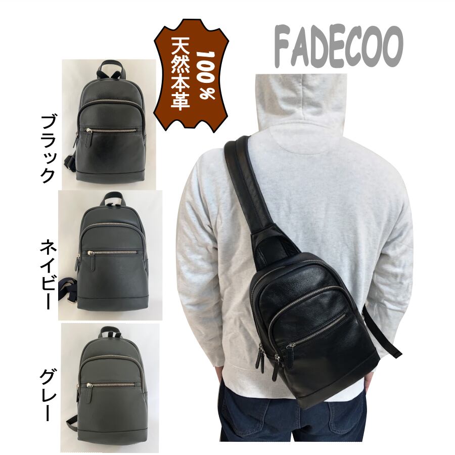 FADECOO】メンズ 厚手の大容量天然本革ボディーバッグです。2つの収納スペースがあります。メイン収納部はダッブルファスナー留め仕様です。中には大き目のメッシュポケットがあります。副収納部もファスナー留め仕様で、中にはペンセットとオープンポケットが二つあります。前面にはファスナー付きポケットが設計されているため、スマホンや鍵・パスケースなどの小物を収納できます。すべての内ポケットの縁回りに良質な山羊革で縁革デザインしております、上品さと強度を高めています。また長時間の使用で、疲れを軽減するため、背部もショルダーストラップにも3ミリ厚さのスポンジを入れてあります。細かな部分まで設計され、縫製されております。背部はゴートレザー素材で、よりよい柔らかく、蒸れにくい、丈夫です。