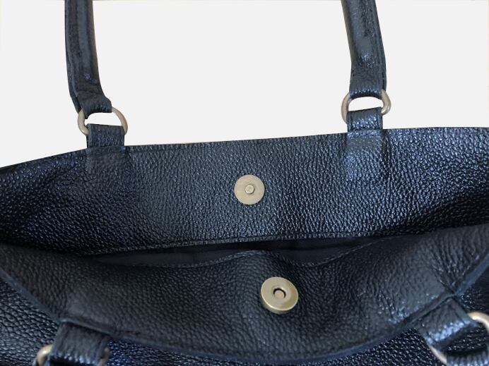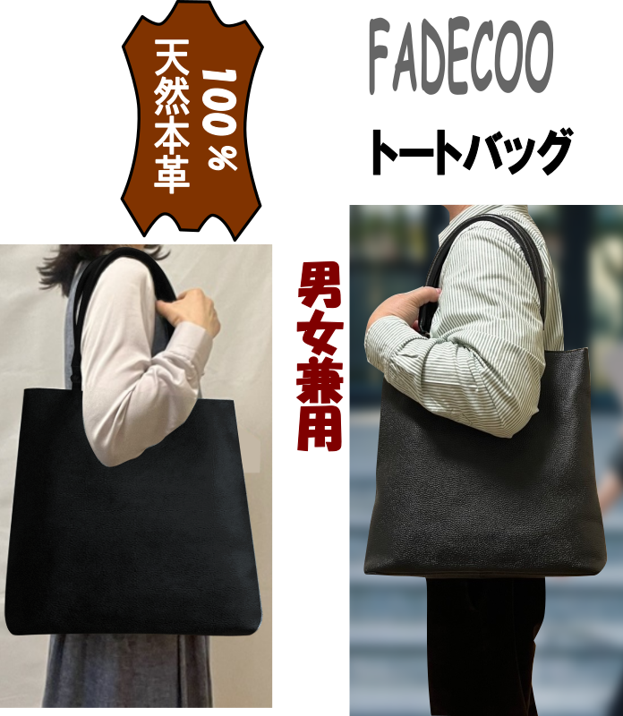 【FADECOO】天然本革 トートバッグ ブラック 男女兼用 開口部はマグネットボタン留仕様です。表も背面も牛革一面で、縫い合わせがありません。14インチノートパソコン入れや iPad及びA4クリアファイル等を楽に収納できます。内ポケットが三つ、背部ファスナーポケットが一つ、スマート収納できます。持ち手高さは21センチがあり、肩掛けもできます。全ての内ポケットの縁回りに良質な山羊革で縁革しておりますので、強度と上品さがアップしております。
