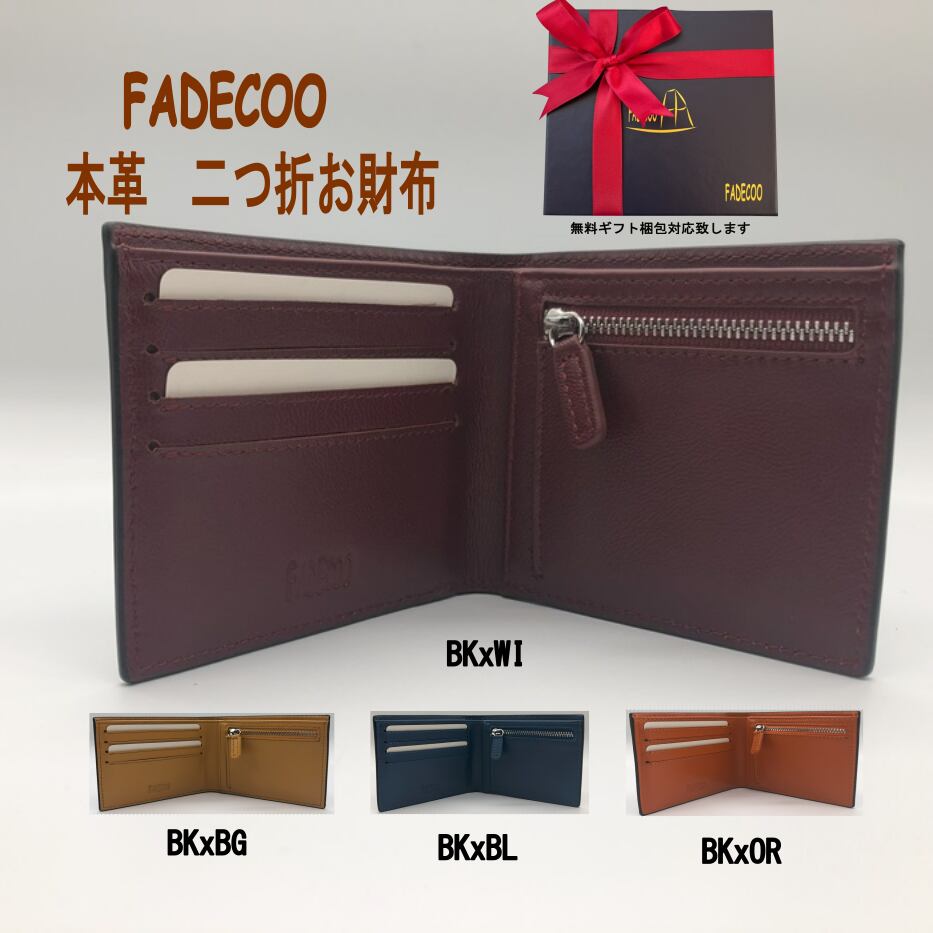 【FADECOO】本革メンズ二つ折りお財布です。表も内側も全部本革で作られ、サイズ感が小さいけど 長財布並みの大容量で お札 小銭 クレジットカード、ポイントカード、各種交通機関カード 領収書等々しっかり収納できます。外側はブッラクで、内側は少し明るい色を採用 お洒落感がアクセントポイントになります。豊富なカラーパリエーションから お好みの色を選択できます。コインケースが滑らかさと耐久性に優れたYKK ファスナーを使用しています。