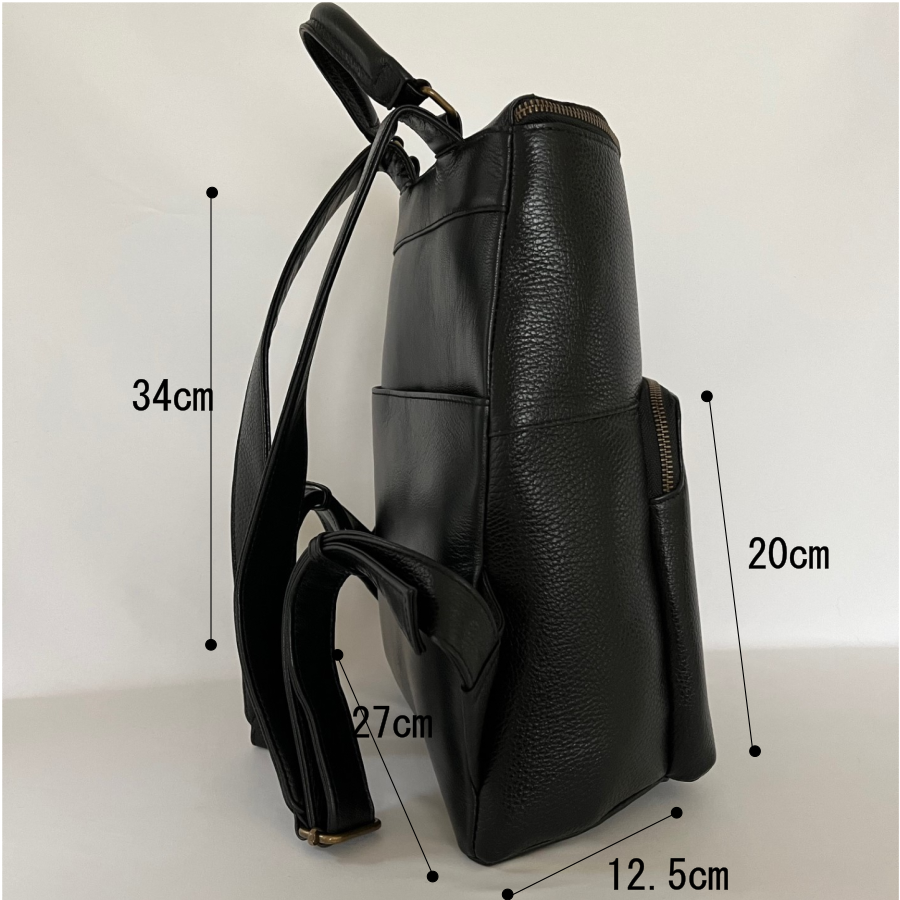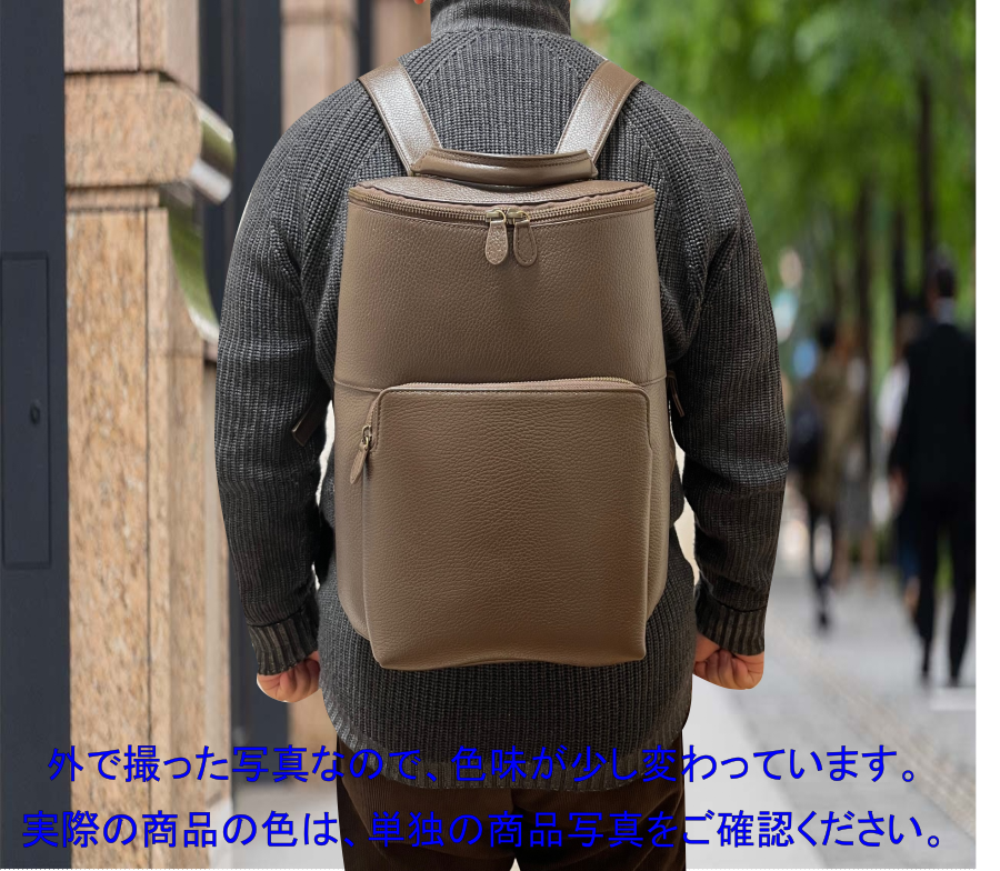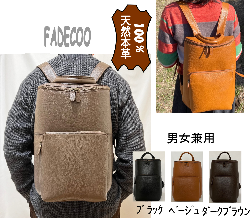 【FADECOO】厚手本革バックパックです。通勤や旅行、出張など 男女兼用です。メイン収納部はダッブルファスナー仕様で、14インチノートパソコンをしっかり収納できます。中にはファスナー付きポケットが一つあります。オープンポケットが三つあります。すべての内ポケットの縁回りに良質な山羊革で縁革をデザインし、強度を高めています。ハーフの仕切りも設けてあるので、衣類や書類などをスマート収納可能です。表面に大き目のファスナー付き3Dポケットが一つあります。その中には一つオープンポケットがあります。背部にもA4を楽に収納できるポケットがあります。背部の革は上質な柔らかい山羊革で、蒸れにくい、丈夫です。外側のファスナーは全部耐久性に強いYKKファスナーを使用しています。
