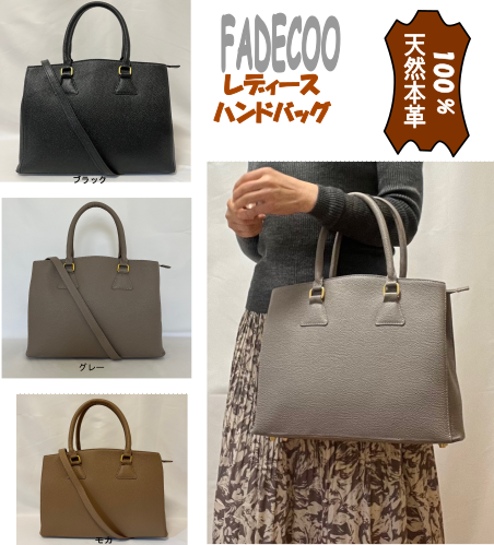 【FADECOO】2WAY 天然本革 ショルダー付きハンドバッグです。開口部はファスナー留め仕様で、中にはファスナー付きの仕切りが真ん中にあるため、三つの収納スペースになり、整理しやすいです。また、内部にも縁革オープンポケットが三つあります、縁革ファスナーポケットが一つあります。身の回りの貴重品や常備品などをスマートに収納することができます。A4ファイルやiPadなども楽に入れますので、通勤、出張、お買い物、セレモニーなど幅広い使える商品です。背部にもファスナーポケットが一つあるので、ハンカチや鍵、パスケースなどの小さいアイテムをすぐに取り出すことができます。外側に装備しているすべてのファスナーは、耐久性に強いYKKファスナーを使用しています。